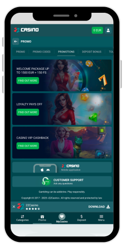 Ao preparar esta análise do 22Casino, explorei cuidadosamente tanto a versão desktop quanto a versão móvel do site. À primeira vista, o design pode parecer um pouco desatualizado, mas a funcionalidade do site funciona perfeitamente. Estou confiante de que este cassino atrairá iniciantes que procuram um site com risco financeiro mínimo. Isto porque o cassino oferece depósitos mínimos atrativos a partir de €10, e os requisitos de bônus também começam a partir desse valor. Além disso, antes de se registrar, os jogadores têm a oportunidade de experimentar versões demo gratuitas dos jogos.