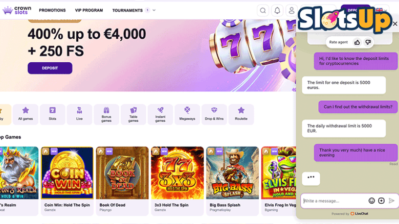 CrownSlots o Casino oferece um bônus de boas-vindas substancial de 400% até 4.000 euros, juntamente com 250 rodadas grátis. Os jogadores podem receber esse bônus nos seus primeiros quatro depósitos, embora o requisito de apostas para o bônus seja de 40x, o que é considerado alto em comparação com os padrões do setor.
