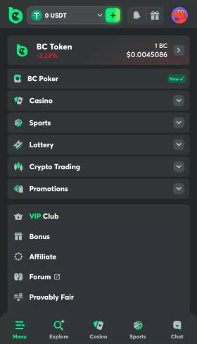 Os sites de casino com criptomoedas têm normalmente como objetivo inscrições rápidas, depósitos rápidos e levantamentos rápidos. Tomemos como exemplo o casino online BC.GAME. Estamos a considerar a interface da versão móvel, uma vez que mais de 80% dos jogadores a utilizam.