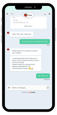 Também testei o formulário de feedback e o e-mail — as respostas chegaram, mas mais lentamente. Esperei algumas horas. Portanto, se quiser uma resposta imediata, o chat ao vivo é definitivamente a melhor opção. No geral, considero o suporte do casino Spinia excelente — posso até dizer que é um dos melhores.