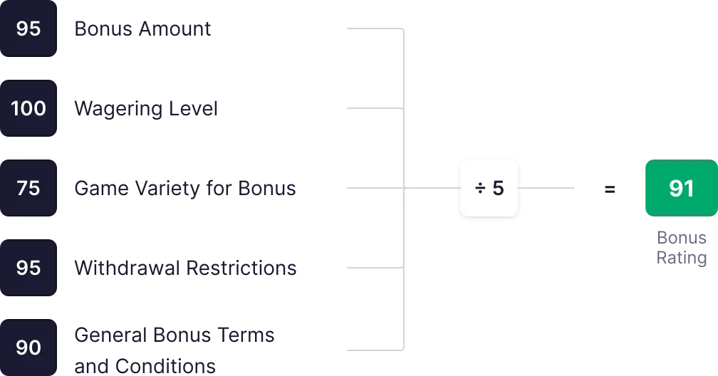 | Si el casino ofrece bonos (de bienvenida y exclusivos sin depósito) con requisitos bajos o promedio. | 100 |