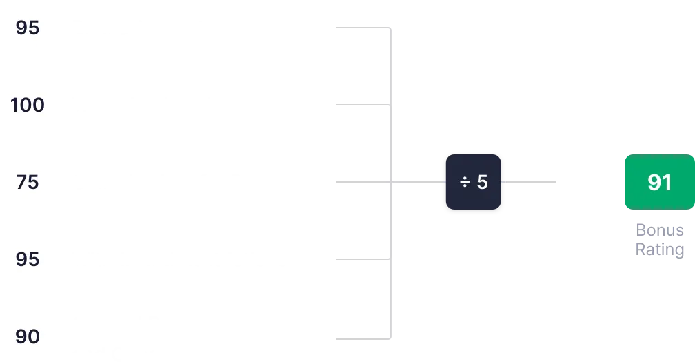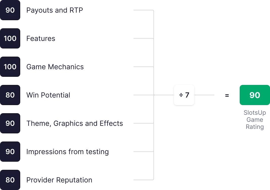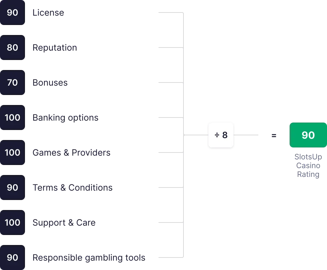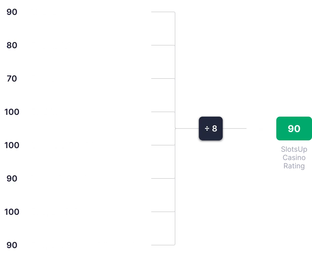 La Calificación de Casino SlotsUp se calcula en base a 8 métricas clave, cada una puntuadas de 0 a 100. Estas puntuaciones se suman, promedian y se usan para determinar la calificación final global.