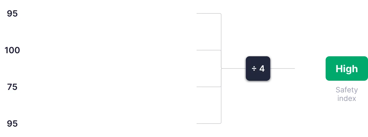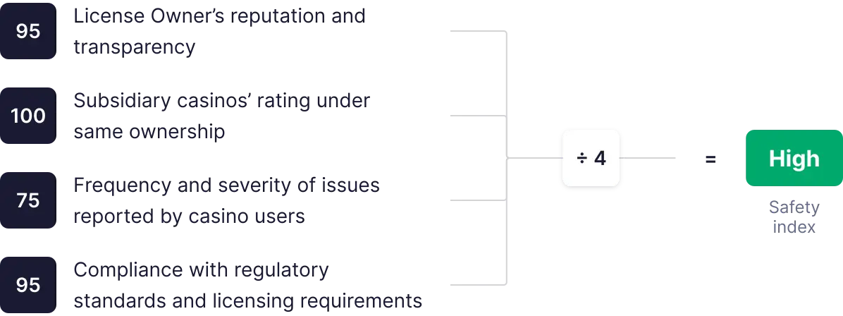 Evaluamos la seguridad de un casino en función de 4 criterios (2 individuales y 2 interrelacionados), cada uno calificado de 0 a 100. Luego se suman y promedian las puntuaciones para determinar el índice de seguridad final.